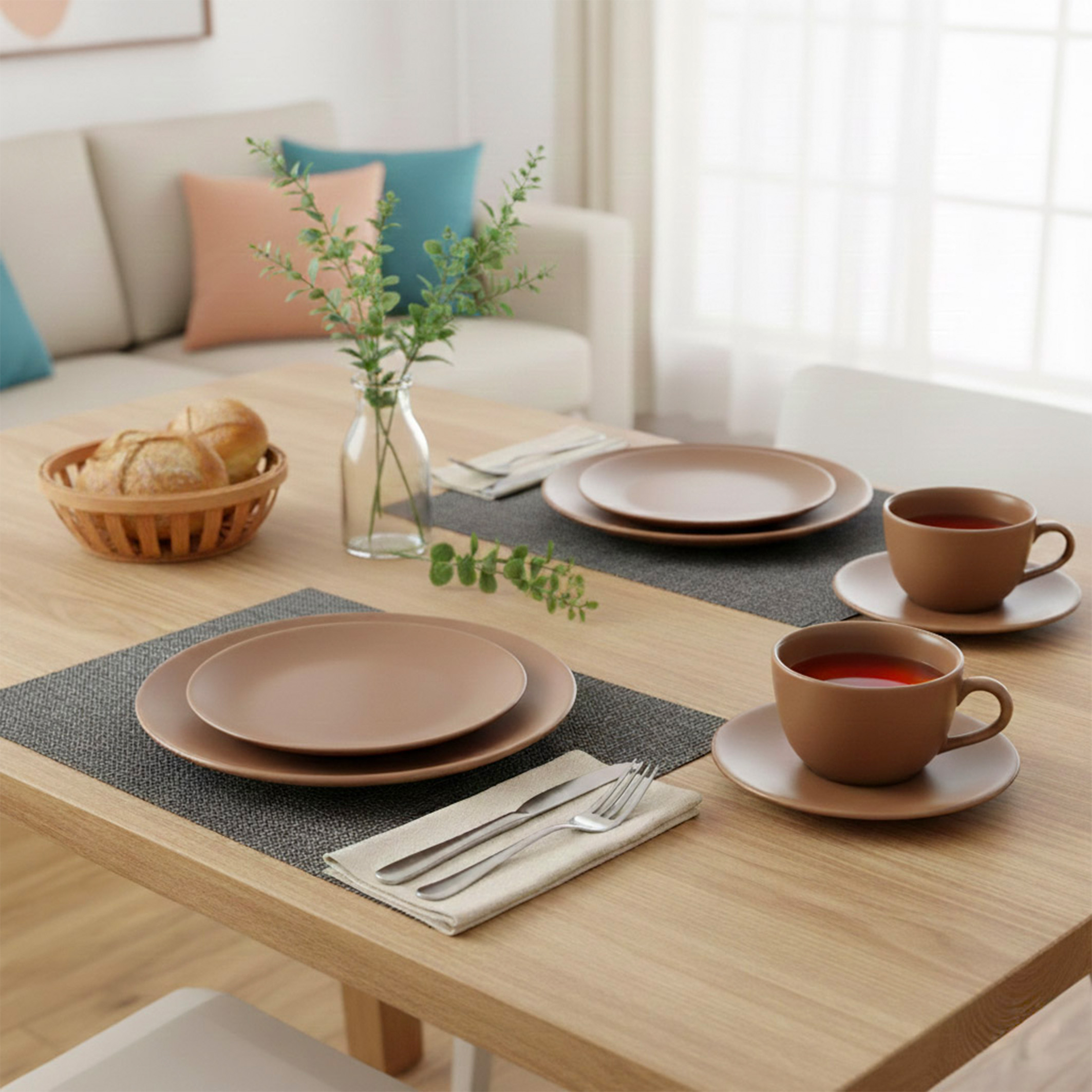 INCLUYE: 6 PLATOS PLAYOS 26 CM, 6 PLATOS HONDOS 20.5 CM, 6 PLATOS POSTRE 19 CM Y 6 TAZAS DE TE 200 CC CON PLATO